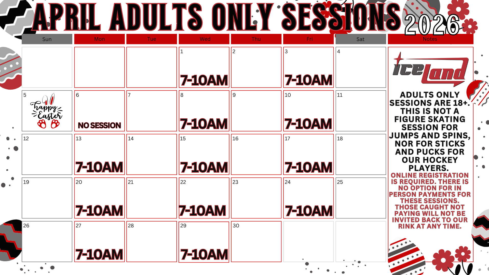 *This is NOT a freestyle session! If you are an adult skater working on higher level jumps, spins, this is not for you! This is NOT a hockey session. No stick/pucks.