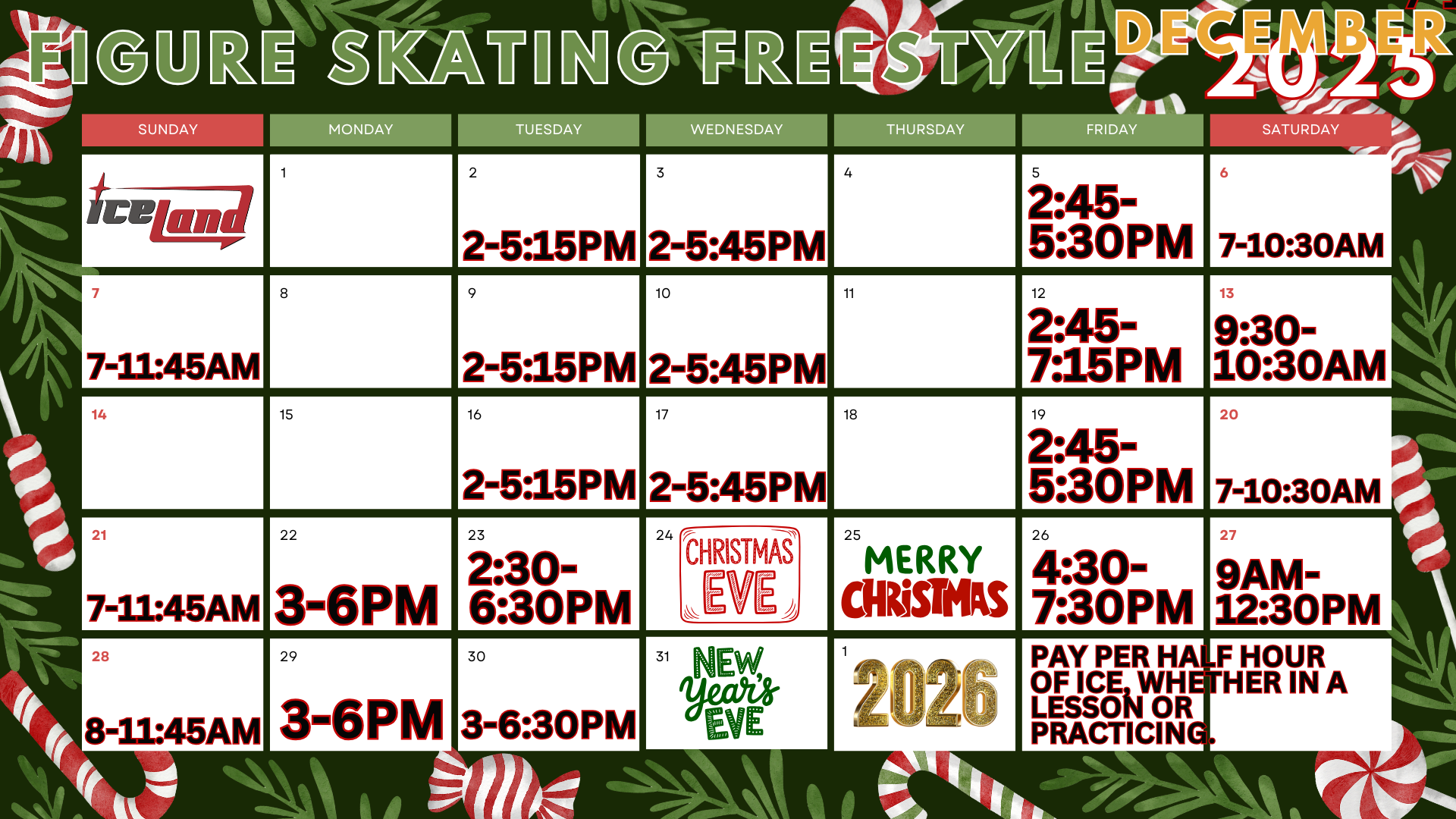 Figure Skating Freestyle sessions are reserved for our Figure Skaters. Figure Skating Freestyle sessions are paid PER half hour. If you are taking a lesson during Freestyle, you MUST pay for the ice during that time as well. Upon arrival at the rink, check in with the Front Desk to arrange payment for your sessions. Those caught not paying for their sessions, will be terminated from the rink. Check back here, or our Main Schedule, for changes, additions, etc.