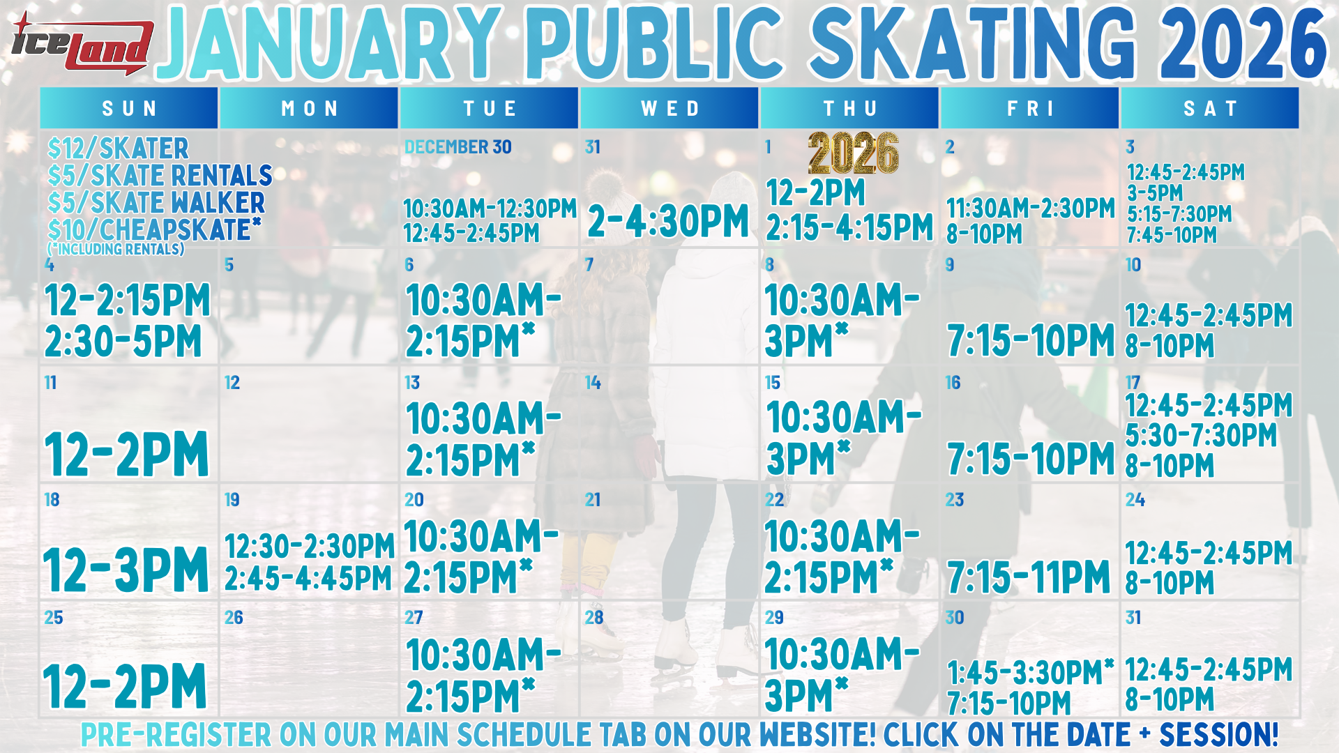 Please pre-pay for your session at the link above. We kindly ask all guests to pay with our online link before coming to the rink. Otherwise, they will be asked to scan the QR code at the rink. Please check in at the Front Desk upon arrival. Thank you! (There are no refunds or credits for unused registrations.)