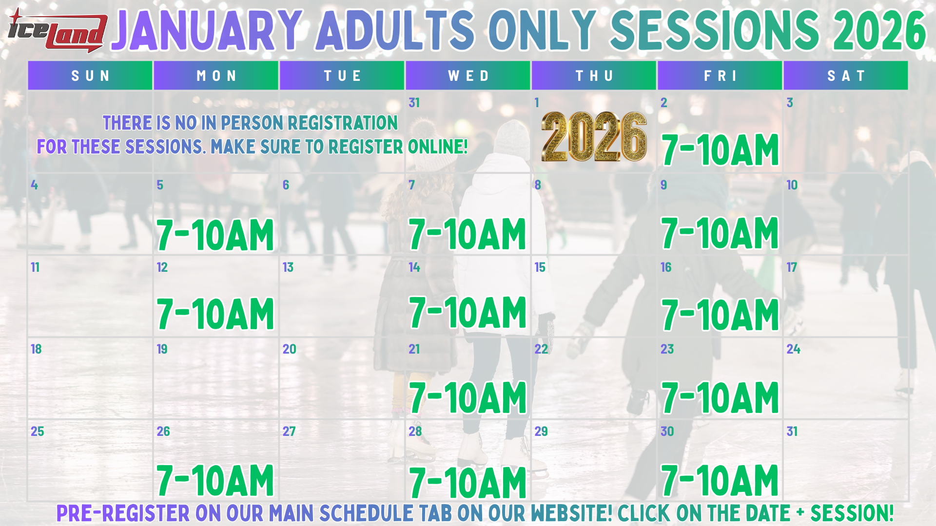 Adults ONLY (18+) skating sessions, 7-10AM, Monday, Wednesday and Friday! (Schedule changes in the summer due to camps. Tournaments/holidays will change the schedule. The schedule will always be updated online.)