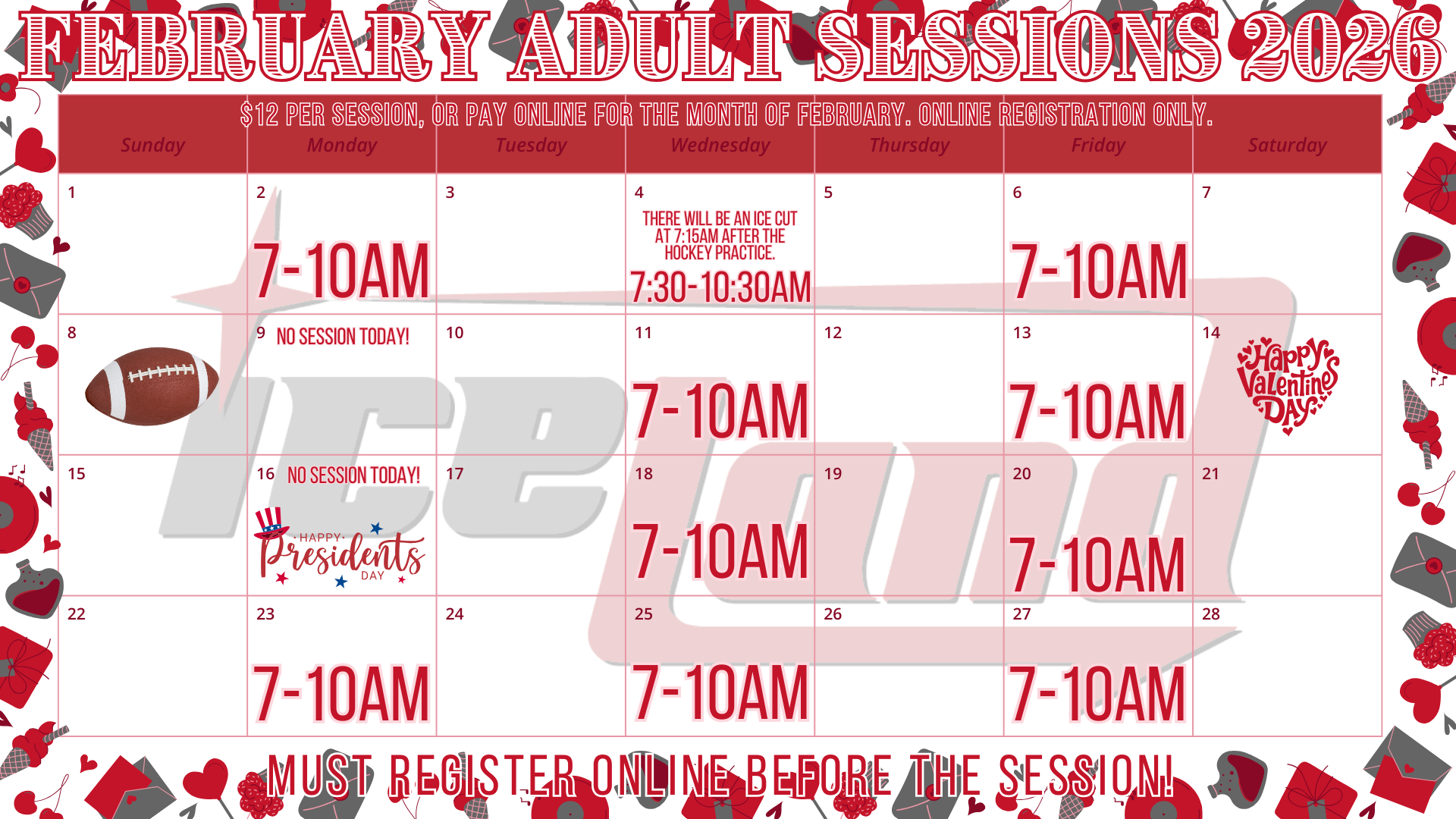 *Payments may be made monthly or for each session BEFORE going on the ice. There will be NO in person registrations. No exceptions. Violators will be asked not to return.