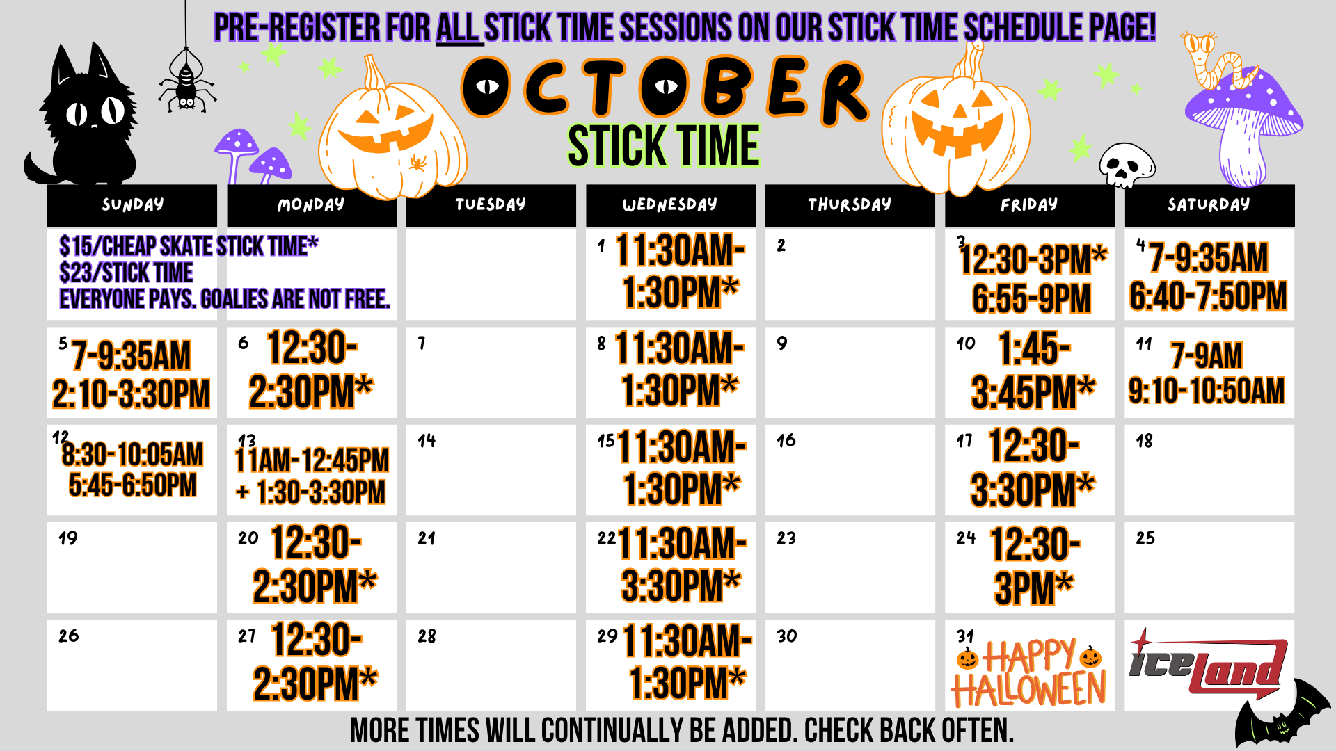 Stick Time at Ice Land is for our hockey players as a practice session. Helmets, gloves, skates + sticks are required. BYOP - Bring your own pucks. Everyone pays for Stick Time. Goalies are not free.